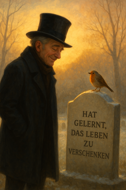 Ebenezer Scrooge. Der alte knorrige Geizkragen aus Charles Dickens' Weihnachtsgeschichte. Wie würde er mit dem Geist der Zukunft auf sein Grab schauen, nachdem er erkannt hat, was wirklich wichtig ist? Würde er so lächeln, wie auf diesem KI-generierten Bild?